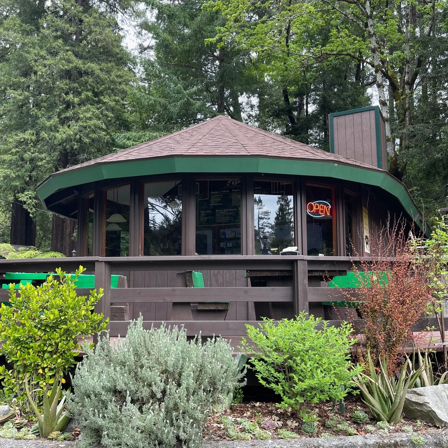 Cafe featuring locally-raised grass-fed beef burgers, fresh baked pies, cookies, gluten-free options, soft serve ice cream, shakes and floats. Indoor and outdoor seating with views of the towering redwoods and Eel River. Seasonal Hours.